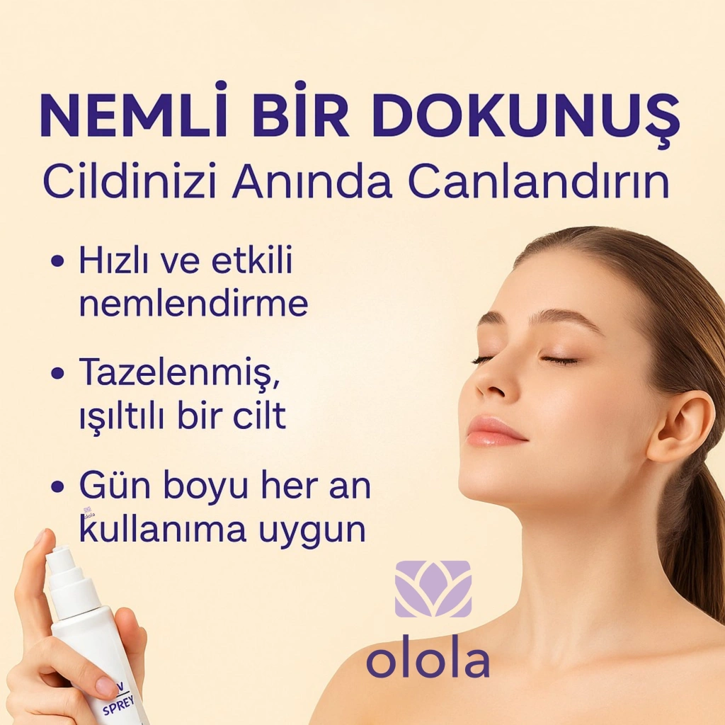 Soğuk hava, rüzgâr, kuru ofis ortamı… Cildin yorulduğunda seni toparlayan en pratik çözüm burada. Olola Nem Spreyi, özel mikro-nem teknolojisi sayesinde cilde saniyeler içinde taze bir ışıltı verir. Makyajı bozmaz, yağlandırmaz, gün boyu kuruluğu engeller.